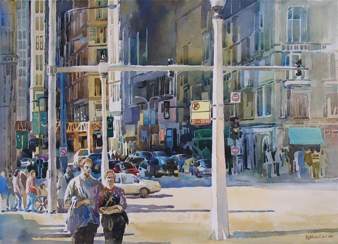In Woon’s other painting ‘Singapore River and Reflection’, he designed the direction, size of the boat together with the placement and different intensity of the reflections. The complex interaction of each subject matter here allows a viewer’s visual sequence to happen according a properly planned speed and direction. Therefore, whichever angle or corner, a viewer enters the image, will still lead his/her vision sequentially across the whole composition. “This is the power of visual language,” said Woon who believes that a painting process involved a lot of understanding of visual process and sequential behaviours of a viewer.